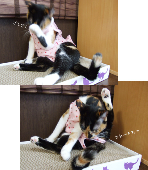 患部が気になるらしく、暇さえあればお腹を舐めようと必死でした